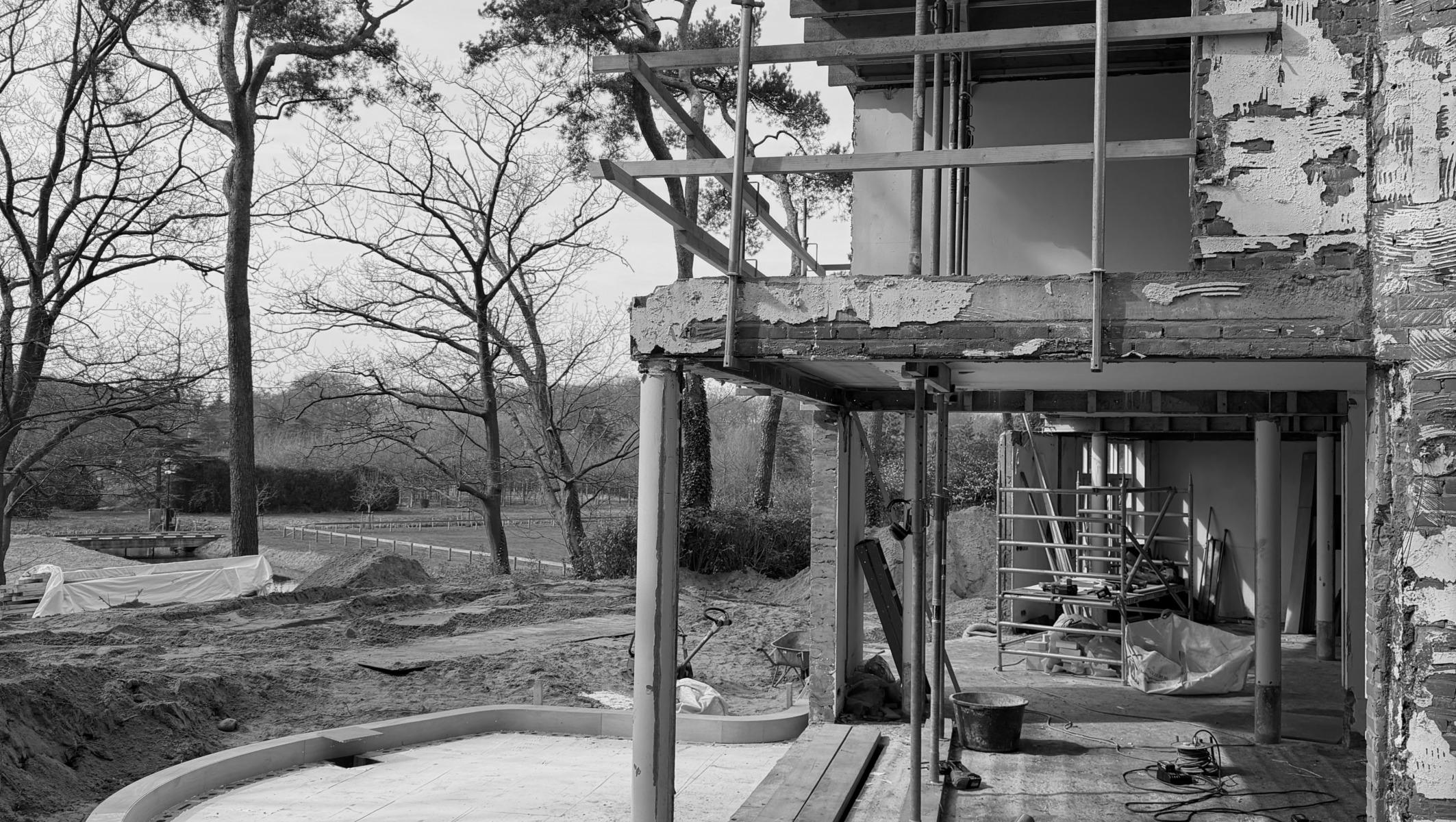 Het nieuwe ontwerp breekt radicaal met de hoekige architectuur van het originele pand. Door specifiek gebruik te maken van afgeronde hoeken in de gevels en de terrassen, ontstaat er een vloeiend volume. Daarnaast zorgen grote, gebogen glazen puien op de begane grond voor een panoramisch uitzicht op de tuin. Deze puien brengen tegelijkertijd een overvloed aan daglicht diep in de woning, waardoor de grens tussen de binnenruimte en de natuur nagenoeg is opgeheven.