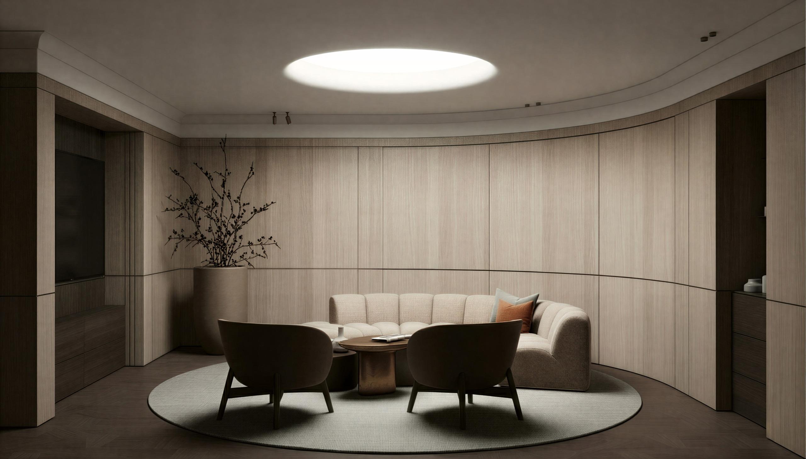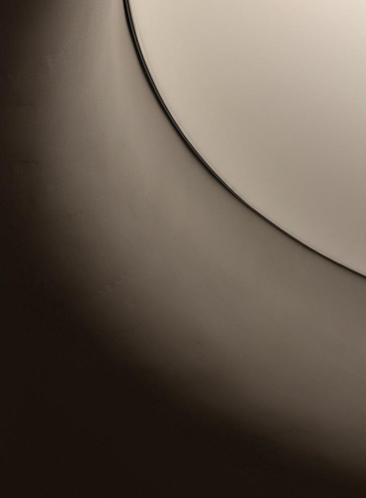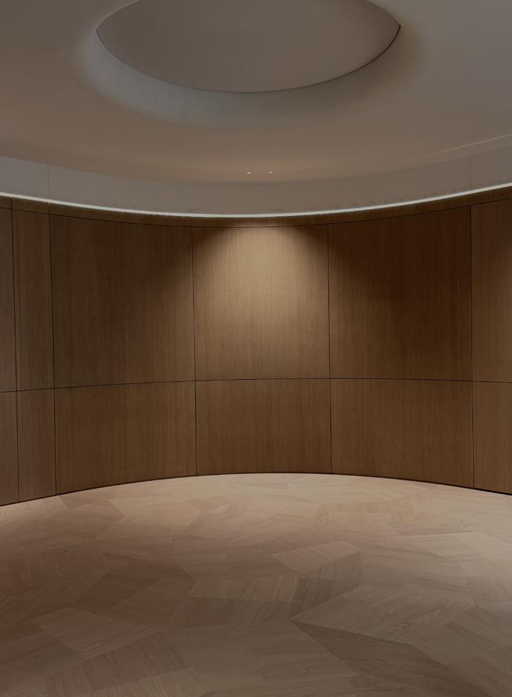 Verlichting vormt een integraal onderdeel van de constructie. Indirecte lichtlijnen snijden door het volume en accentueren de welvingen en de overgangen tussen wand en plafond. Het monumentale circulaire plafondelement dient als architectonisch ankerpunt en geeft zowel hoogte als richting aan de ruimte.