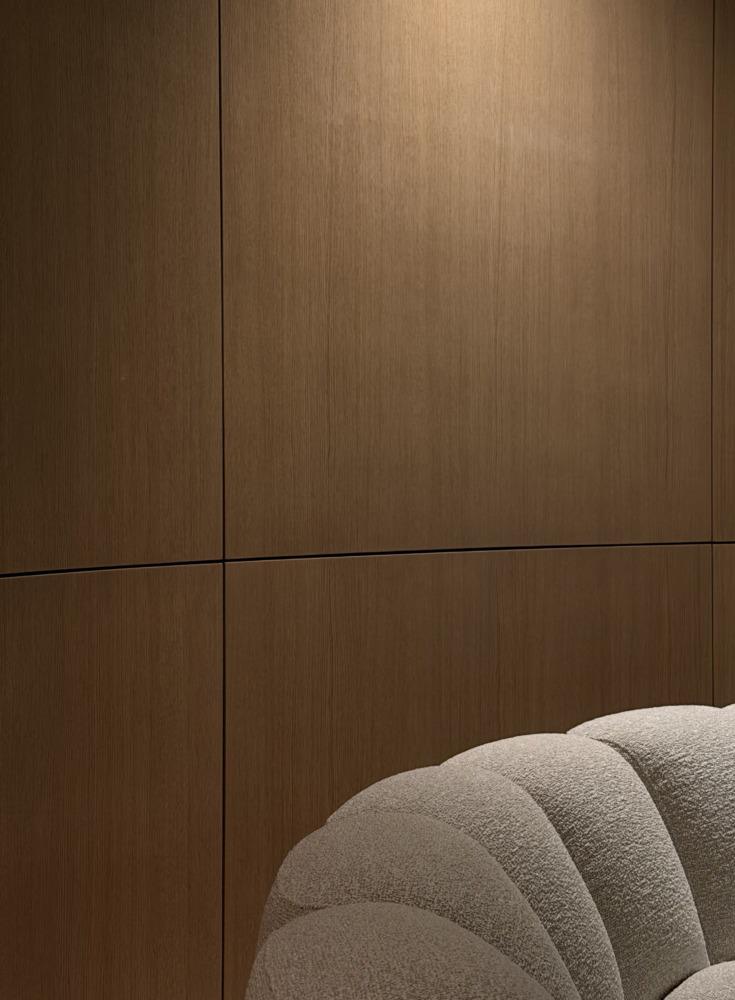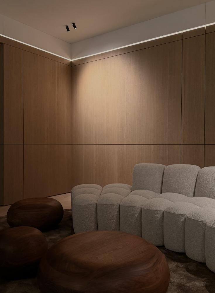 De basis bestaat uit kamerhoge eikenhouten wandpanelen. We hebben afgeronde wanden gebruikt om het architecturale volume te verzachten en een vloeiende overgang door de ruimte te creëren. De strakke verticale uitlijning en diepe schaduwvoegen geven het hout een ritmisch karakter. Dit gestructureerde lijnenspel is bewust in balans gebracht met een modulaire bouclé sofa en massief houten, organische vormen — een weloverwogen contrast tussen rigide architectuur en zachte tactiliteit.